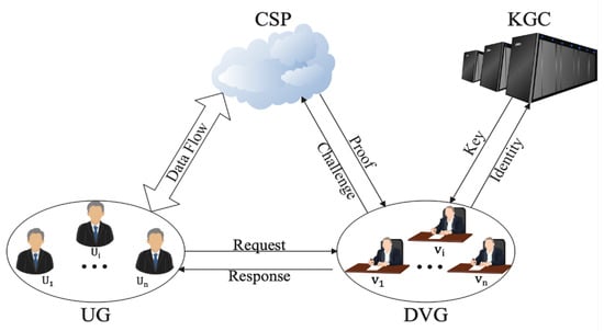 In this paper, the system model of our proposal consists of four institutions: a user group (UG), a cloud service provider (CSP), a designated verifier group (DVG), and a key generation center (KGC); the specific definitions are as follows.