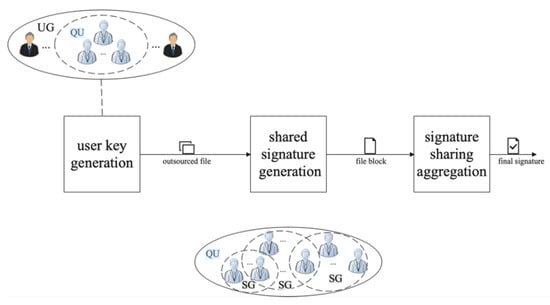 The signer group is made up of multiple signers [22]. Any t or more qualified signers in a user group can cooperate with each other to generate a valid final signature group, but less than t signers cannot generate a final signature group. In addition, only the designated verifier who knows the public key associated with the signer group verifies the correctness of the final signature. In the event of a problem or if necessary, the signer group can certify to a third-party auditor that the final signature is effective under the signer group’s public key. The following describes the process of the threshold signature [3]. First, all users, with the help of the user group, generate their shared public–secret key pair using a random polynomial function. Then, the user who generated a valid shared key pair is allowed to produce a shared signature. Lastly, t valid shared signatures are collected and utilized to aggregate the final signature of the data block.