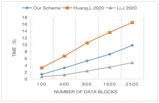 In the first experiment, we compared the performance of the of the three proposals, and the experimental results are shown in Figure 3. The horizontal axis of Figure 3 displays the number of data blocks utilized to generate the final signatures, and the vertical axis displays the computational time taken. As can be seen from Figure 3, when the number of data blocks increased, the computational time cost also increased linearly. The computational cost of the final signature generation in our proposed scheme was much higher than that of the scheme in [4], but lower than that of the scheme in [17]. The main reasons were: On the one hand, qualified users needed to sign all data blocks in scheme [4], but just signed partial data blocks in our scheme. On the other hand, each data block was signed by qualified users in our scheme, but the data blocks were just signed by one user in scheme [17]. However, our scheme had the advantage of sharing data among multiple users and eliminating managers compared to scheme [17].