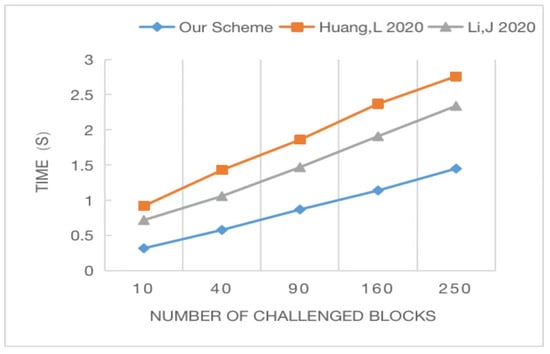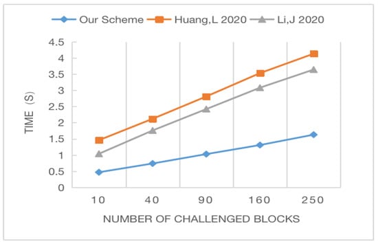 In the last experiment, we compared the performance of the of the three proposals, and the experimental results are presented in Figure 5. The horizontal axis of Figure 5 displays the number of challenged blocks utilized to verify the proof by a designated verifier, and the vertical axis displays the computation time taken. We can see that the computational cost increased linearly as the number of data blocks increased. Since the number of challenged data blocks c in our proposal was much smaller than in [4,17], the computational cost of the designated verifier verification was less than in the two other schemes.