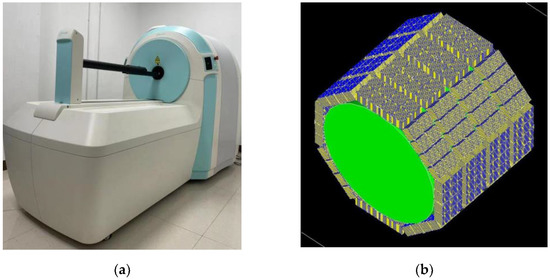 This study was conducted using an integrated PET/CT system based on lutetium silicate scintillation crystal (LYSO), a device developed by Shandong Madic Technology Co. Ltd. in Shandong, China specifically for rodent imaging. An illustration of the appearance of the MetisTM PET/CT system can be found in Figure 1a. This system has a cylindrical PET tomography scanner with 32 detector blocks arranged in four rings. The diameter of each ring is 129 mm, while the diameter of the effective ring is 81 mm. The axial range of the system is 122 mm. Each detector is equipped with 1152 LYSO crystals with a size of 0.943 × 0.943 × 10 mm3. The center-to-center distance between crystals is 1.028 mm. The crystal blocks are separated by a gap of 1.749 mm. A SiPM plate is attached to each crystal block. In Figure 1b, a simulated MetisTM PET/CT device system is shown using GATE, a high-energy physics simulation toolkit based on Monte Carlo simulations.
