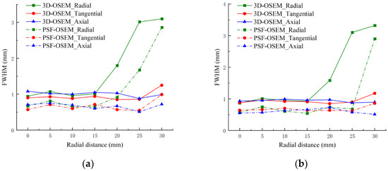 The radial, tangential, and axial FWHM of 22Na point sources were measured at 5 mm and 15 mm from the FOV center in the axial direction using both 3D-OSEM and PSF-OSEM, respectively: (a) FWHM in three directions at 5 mm; (b) FWHM in three directions at 15 mm.