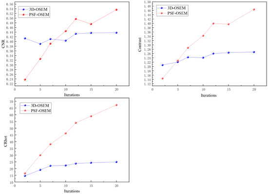 Compared to the PET images reconstructed by the 3D-OSEM algorithm, the PSF-OSEM algorithm improves the visualization of the PET images of the Derenzo phantom at the hot rod of 0.6 mm. Figure 7 shows PET images of the Derenzo phantom based on two different algorithms. For both algorithms, the reconstruction parameters are 5 subsets and 5 iterations, 7 iterations, 10 iterations, 12 iterations, 15 iterations, and 20 iterations. The same number of iterations and subsets are presented with different visual effects by different reconstruction algorithms. In Figure 7, it can be seen that the PET images reconstructed with the PSF-OSEM algorithm are clearer than those reconstructed with the 3D-OSEM algorithm. The hot rod of 0.6 mm in the image of the Derenzo phantom reconstructed with the PSF-OSEM algorithm can be clearly identified, while the 3D-OSEM algorithm does not distinguish the hot rod of 0.6 mm more easily than the PSF-OSEM algorithm. However, at the right edge of the Derenzo phantom, the noise of PET images reconstructed by the PSF-OSEM algorithm is higher than that of the 3D-OSEM algorithm. Visually, the 3D-OSEM algorithm reconstructs better image quality from 7 iterations and 5 subsets to 10 iterations and 5 subsets. The PSF-OSEM algorithm reconstructs higher-quality images from 10 iterations and 5 subsets to 15 iterations and 5 subsets. When the number of iterations increases, the images become blurred. Due to the different numbers of iterations, the metrics used to measure their image quality can be affected. According to Figure 8, there is a significant difference between the values of CNR, contrast, and CRhot under different reconstruction algorithms. The PET images of the Derenzo phantom reconstructed by the PSF-OSEM algorithm have a higher CNR, contrast, and CRhot than those reconstructed by the 3D-OSEM algorithm in general. The CNR and Contrast of the 3D-OSEM algorithm are only higher than those of the PSF-OSEM algorithm when the number of iterations is small.