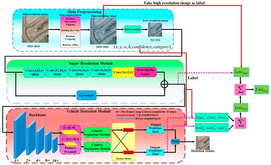 (2) We designed SRM and VDM, aiming to recover a high resolution sensing image from its low resolution counterpart and perform vehicle detection. In VDM, we introduced a context expansion module to increase the context information of the vehicles.