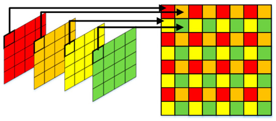As shown in Figure 2, five convolutions are used to extract the features first. We denote a convolution layer as , where represent the number of input channels, the number of output channels and the filter size, respectively. Then, we propose to use a pixel shuffle layer to reconstruct the high resolution output. As shown in Figure 3, the input feature map of the pixel shuffle layer will be divided into four parts channel-wise, such as red, orange, yellow and green. Each part will be resettled adjacently to reconstruct a high resolution image. With the pixel shuffle layer, the feature maps can be transformed from to (), which guarantees the reconstruction of the three RGB channels, where , and denote the width, height and channels, indicates the scaling ratio of feature maps. To enhance the reuse of the features, we add the output of the shuffle pixel layer to the up-sampled low resolution image by Residual block [36]. The SRM can be represented as follows: