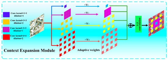 To increase the context information, we use dilated convolution to design a context expansion module. As depicted in Figure 4, we utilize four convolutions with different dilation rates and kernel sizes to expand the receptive field, i.e., kernel size 1 × 1, kernel size 3 × 3 with dilation rate 1, kernel size 3 × 3 with dilation 2 and kernel size 4 × 4 with dilation rate 2. Compared to the original 3 × 3 convolution layer, we examine a single location four times with a different receptive field. The information extracted from various scopes in this hierarchical structure contains both global and detailed information of the current region. Finally, to show different contributions of the output features with different receptive fields, each output features are multiplied by weight , which can be learned adaptively. Feature fusion is performed by adding the features with a different receptive field, which can be calculated by (2):
