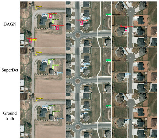 To assess SuperDet’s detection capabilities qualitatively, Figure 6 depicts the visualization of the detection results of DAGN and SuperDet on VEDAI dataset. The fault detection and the missed detection are marked in the red box. Compared with the Ground Truth, it is obvious that some vehicles have been missed and some have been detected with fault categories by DAGN. SuperDet can effectively alleviate the above problems by recovering the details of the vehicle from its low resolution image. The results demonstrate that SuperDet has good detection performance in different scenes, such as desert scene (first column), road scene (second column) and farmland scene (third column).