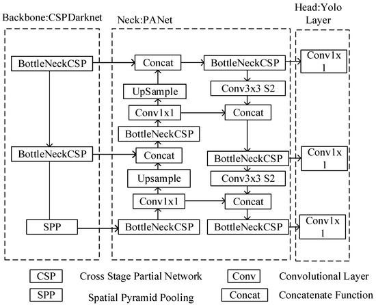 Additionally, YOLOv5s includes the CBL module, the Focus module, the SPP module, and the CSP module. It firstly performs convolution, batch standardization, and activation functions, which are then transferred to the Focus module for slicing processing, thereby minimizing the loss of image data. Then, it performs downsampling and the SPP module combines all parts, integrates the extracted features, and sends them to the CSP module for integration processing. The YOLOv5 network model is depicted in
