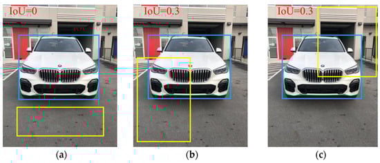 Figure 8b,c, when the prediction box is the same size as the actual box, the IoU calculation yields the same result; therefore, no judgment can be formed.