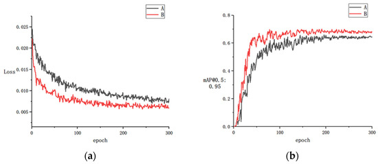 Beginning with an initial learning rate of 0.01, SDG was used to optimize algorithm parameters and the cosine annealing approach was employed to dynamically modify the learning rate. The weight attenuation coefficient was set to 0.0005, the learning momentum was set to 0.937, and the Batch-Size to 8. In this experiment, 300 epochs were trained to examine the overfitting issue in the training process. Model A is denoted by the black curve, while model B is defined by the red curve. Models A and B are trained together, and the training outcomes are depicted in