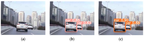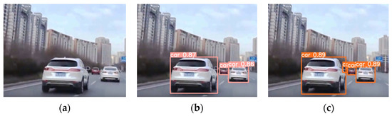 Figure 13c is the detection graph after the improvement of the loss function. The preceding graph demonstrates that the modified algorithm increases the accuracy of vehicle detection, as well as the convergence speed of the loss function and the recognition speed.