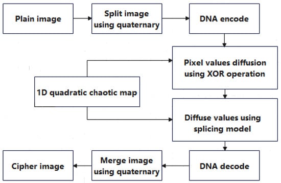 There are three stages in the encryption process: (1) transforming a plaintext image into four DNA sequence matrices; (2) generating a 1D quadratic chaotic sequence and diffusing four matrix pixel values through DNA XOR operation; and (3) a mosaic model is introduced and the four matrices are combined into an image matrix.