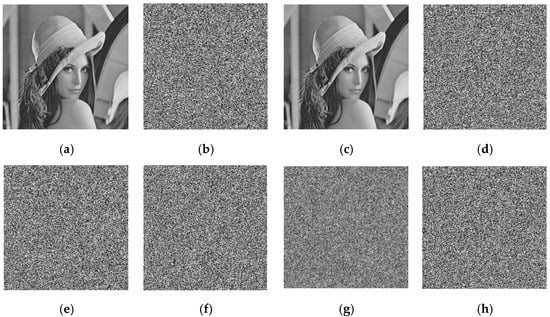 From Table 4 below, it can be concluded that the correlation coefficient between two neighboring pixels of the encrypted image with the original image of “lenna.bmp” is close to 0, and the relationship between neighboring pixels of the image is weak. By comparing the correlation between neighboring pixels of the original image and the encrypted image, the following conclusions can be drawn. In the encryption algorithm, a 1D quadratic chaotic system was used to generate the key and scramble the image, and the mosaic model was introduced to participate in scrambling the image. The correlation between adjacent pixel values of the scrambled image was very low. It showed that the encryption algorithm can effectively resist statistical attacks.