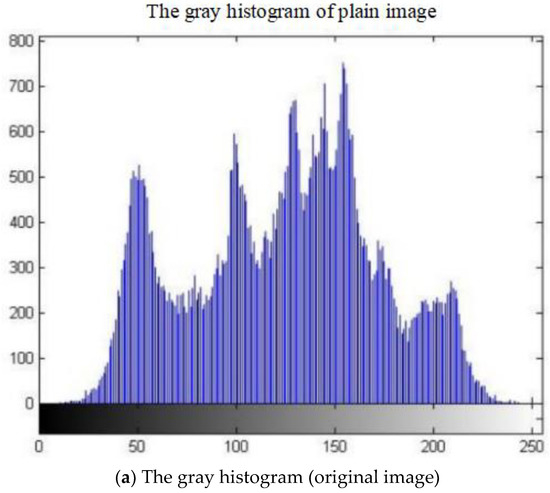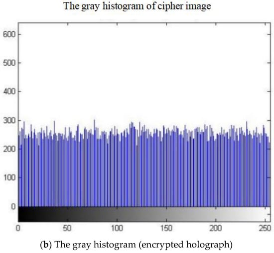 A gray histogram describes each pixel value's frequency in a gray image. Typically, original image pixel values are concentrated on some specific gray values, and encrypted pixel values of the image are evenly distributed on all gray values. The gray histogram of the original image and encrypted digital holograph are demonstrated in Figure 5. From the figure, the distribution of pixel values in the original image is uneven, mainly concentrated on several gray values. However, the pixel values of the encrypted digital holograph are relatively evenly distributed on all gray values. The image encryption system has influenced and changed the distribution of pixel values. The algorithm with a high sense of resisting statistical attacks, which ensures the security of images in the process of transmission.