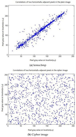 First, 1000 pairs of adjacent pixels were selected from the original image, and the correlation was calculated in horizontal, vertical, and diagonal directions. Similarly, 1000 pairs of adjacent pixels were selected in the same position in the encrypted image, and the correlation was calculated in horizontal, vertical, and diagonal directions again. Figure 6 correlation coefficient analysis demonstrates the relationship between the two horizontally adjacent pixels in the original image and in the encrypted digital holograph is very different. From Figure 6a, the pertinence of two horizontally adjacent pixels is strong. From Figure 6b, the pertinence of two horizontally adjacent pixels is weak.