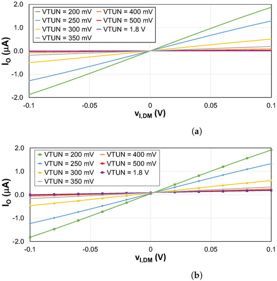 Transconductor output current as a function of the input DM voltage: (a) simulated and (b) measured responses.