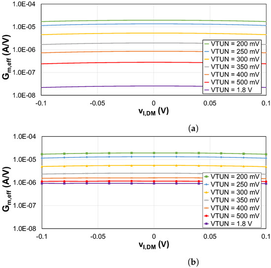 Effective transconductance vs. : (a) simulated and (b) measured responses.