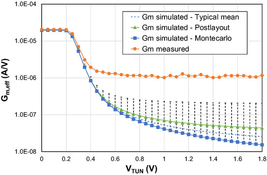 Different sources of error, including systematic and random mismatches, could explain the divergence between the simulated and the experimental response of the effective transconductance, which becomes evident from Figure 7 and Figure 8. Nevertheless, the analysis of the experimental results obtained in the eight available samples of the transconductor showed that, in all the cases, the measured presented a maximum level very close to the simulated value and a minimum bound always higher than the value expected from the simulations. This fact suggests that the limitation preventing achieving a very low transconductance could have a systematic origin. Besides, the Monte Carlo analysis reported previously showed that the experimental error of the transconductance was larger than the standard deviation of the simulated results, which was mainly caused by random variations. For these reasons, the inclusion of transistors M1T and M2T in the overall structure, along with a possible underestimation of their on-resistance in the transistors models, was considered as the main factor causing the divergence of the experimental transconductance from the expected response when the transconductor was programmed to generate low values.