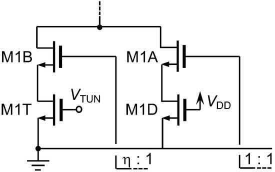 Multiple solutions have been proposed in the literature to attain a low- transconductor. On the one hand, linearization techniques lead to a reduction of the effective transconductance of a differential stage. Among them, we can mention source degeneration [19,20], bump linearization [21], or triode operation [22]. Furthermore, the current division approach [12] enables increasing the current levels, in order to obtain a good matching, while simultaneously resulting in a very low value. Signal attenuation is another widespread technique used to reduce the effective transconductance of a differential stage. To this end, either passive components [23] or active devices with an inherently attenuating response, such as bulk-driven [24] or floating-gate [25] MOS transistors, can be used. Regarding the tuning of , common approaches are based on modifying the biasing current levels of the input section [5] or the drain-to-source voltage, , of the input devices when they are operated in the triode region [26]. Besides, the use of component banks that can be digitally controlled [27,28] or the inclusion of continuously adjustable current mirrors [29] is an extended practice.