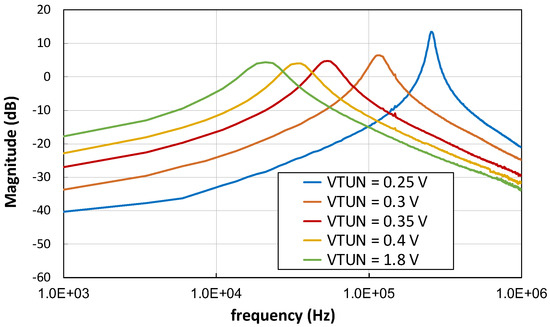 The frequency response of the magnitude of the -C BPF is illustrated in Figure 10, measured for different values of the tuning variable . The center frequency varied from 258 kHz down to 22.4 kHz as the tuning variable, , was increased from 0.25 V to 1.8 V. The overdamping observed in the plot corresponding to = 0.25 V was due to the proximity of the center frequency of the filter to the secondary poles of the transconductors and was boosted by the effect of the value of Q selected. As the level of was made higher, the filter center frequency was separated from the secondary poles and the overdamping was reduced.