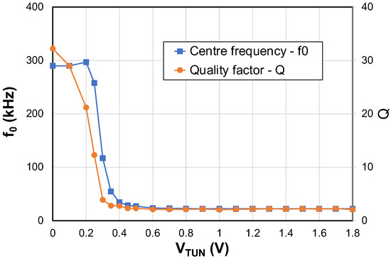 The response of the filter center frequency, , was measured over the entire range of the tuning magnitude, , that is from 0 V to 1.8 V, and is depicted in Figure 11. As observed, the center frequency of the BPF behaved exactly equal to in Figure 8 when was swept. Therefore, the BPF center frequency presented similar limitations in the tuning range as the effective transconductance of the proposed transconductor. Indeed, the simulated frequency response of the BPF led to minimum and maximum values of equal to 500 Hz and 342 kHz, respectively, while the experimental characterization of the filter provided an operating frequency range between 22.4 kHz and 290 kHz. The quality factor as a function of is also represented in Figure 11. Each value of Q was estimated taking into account the measurements of the center frequency and the 3 dB bandwidth of the BPF. For around ground, the high effective transconductance pushed the filter center frequency to high values. Thus, the proximity of the secondary poles of the transconductors to resulted in an increase of the effective value of Q. As was increased, the value of was reduced, and hence, the influence of the secondary poles was alleviated, thus decreasing the quality factor to a level close to the nominal design value.