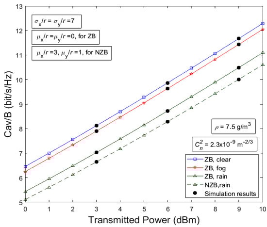 Average capacity (Cav/B) versus transmitted power under clear weather, weak to strong turbulence, moderate to strong water vapor concentration, and strong NZB PE.