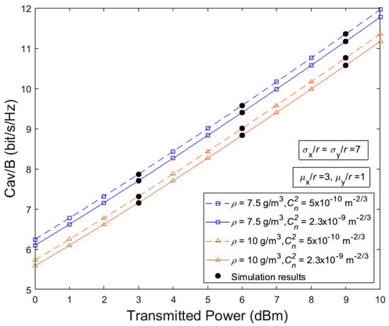 Average capacity (Cav/B) versus transmitted power for strong turbulence, moderate water vapor concentration, and strong PE.