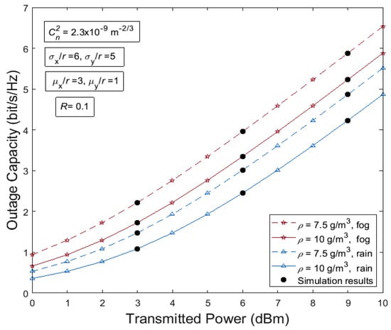 Figure 3 presents the outage capacity of the investigated THz link versus the transmitted power through a strong gamma–gamma modeled turbulent channel with either rain or fog adverse weather effects, moderate or strong water vapor concentration, and FSPL and weak NZB PE. As is the case with the average capacity metric (where higher values lead to enhanced performance results for the THz link), higher outage capacity metric values lead to improved availability results for the THz link. It is therefore mainly shown that more important outage performance degradations are observed for rain weather conditions along with stronger water vapor concentrations, especially for lower transmission power levels. Once again (but in terms of outage capacity availability this time), it is validated that rain is a more destructive effect than fog for THz signal transmissions. Additionally, it is highlighted that, even in rain conditions, the increase in air humidity along the THz channel from moderate water vapor concentration (dashed line) to strong water vapor concentration (solid line) strong air humidity (solid lines) remains a major limiting factor in the THz performance in terms of outage capacity metric.