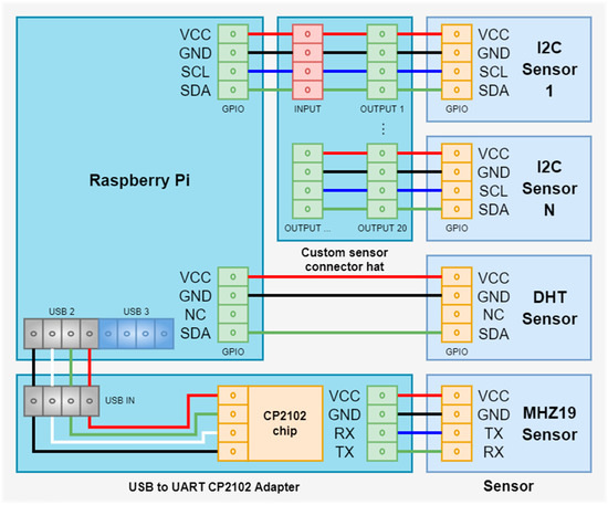 Most of the sensors are connected to microcontrollers via the I2C interface. Some of them have a proprietary interface using one wire or they use a serial communication. In Figure 1, we can observe a generic schema of sensor connection to a Raspberry Pi [11].