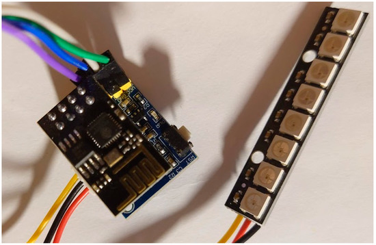 In Figure 2, we can observe a picture of a Raspberry Pi Pico W and the custom adapter where we wired four temperature sensors. The sensors are arranged on three boards, the red board having an HTU21D sensor, followed by an SHT40, and the last board having two sensors, a BMP280 and an AHT20. We are using a module like this when we calibrate the temperature sensors attached to a single board computer such as Raspberry Pi due the fact that those powerful microcontrollers are dissipating heat, and the sensors attached to them are reading wrong values of the ambient temperature. The wiring allows us to move the sensors at about 20 cm away from the microcontroller. In this way, we make sure we can obtain relevant data, closer to reality. Moreover, we are using a combination of sensors because each sensor can have a small error, they are built by different manufacturers, and they use different technologies. In Figure 3, we have an ESP8266 with eight GPIO pins used to control the LED matrix. This ESP8266 can be found in different implementations, with eight pins like in this example or with more, in general with 26 pins if the board includes a screen or up to 30 pins without a screen. Some boards integrate a camera connector, where you can plug in a camera with a resolution of up to 2 megapixels.