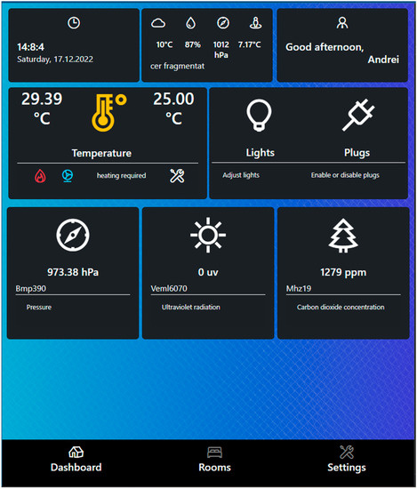 On the left side of the diagram, in the green boxes, we have the frontend, which consists of a web interface launched directly when the SBC starts. The main screen of the interface is presented in Figure 7. We can see the rooms configured in the entire system and have an overview of sensor data. We can also see different parameters of the microcontroller, and in future the user will be able to configure it. At this point in time, the configuration of the microcontroller is possible only from other clients, such as Android, iOS, or Windows client. The architecture of the system can be considered a generic one and is similar to what other researchers are building in their IoT systems [12,13].
