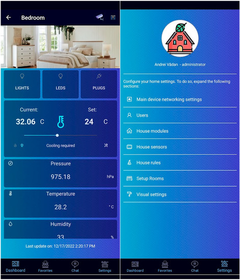 The Android, iOS, and Windows applications, exemplified in Figure 8, are built using Xamarin and interact directly with the main module, which we configure in the application itself. The main module can be represented by any SBC microcontroller. A microcontroller can be used to define multiple rooms, and since we can use wireless sensors, we can choose what sensors are present in a room. The backend has a redirect endpoint which is responsible for getting data from the correct module. Each module is automatically configuring sensors found on the I2C interface or directly connected via USB or serial at each startup. In configuration, we have a property that sets the I2C address of the sensor and IP address of the module where the sensor is connected, so in this way, we make sure that we retrieve data for correct sensor, even if we are using the redirect endpoint. However, the configuration of the rooms is stored only on the main module. Under the ‘Main device networking settings’ section from the client application, you can define a web address, so you can access the backend via the internet. As a result, all endpoints that are not defined will redirect you to a 404 page. As a security feature, if someone tries bad endpoints multiple times, the connection to that machine is denied, and that person is no longer able to reach the module. In future, we plan to also encrypt the requests data for extra security.