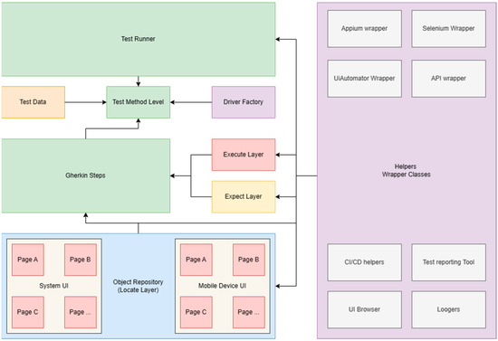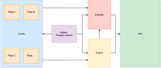 When they design new applications or features, developers usually try to create an architecture of the application using design patterns. For the first time, the term design patterns appeared in building construction [14], and in 1994, for the first time, four developers wrote a book about design patterns in coding [15]. Since then, in building custom automation frameworks, automation developers have used the Page Object Model design pattern. This design pattern has multiple code layers and is very complex. An example diagram can be found in Figure 9.