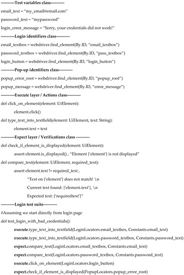 We will apply the following test case to test this page: the user will insert ‘my_email@email.com’ in the ‘Username’ field, ‘mypassword’ in the ‘Password’ field, and will press the ‘Login’ button. Because the credentials are not working, we should see a pop-up displaying this message: ‘Sorry, your credentials did not work!’. This translated in code should result in ‘Test variables’ constant class, where we should see the username, the password, and the error message. The Locate layer should contain two classes, one related to the login page and one related to the error pop-up page. In these pages, we define the automation identifiers or locators. The Execute layer should contain a class, Actions, where we should define two methods, ‘click_on_element’ and ‘type_text_into_textfield’. In the Expect layer, we can create a class Verifications, where we also need two methods, ‘compare_text’ and ‘check_if_element_is_displayed’. In Figure 12, there is a pseudo-code of the implementation using a Selenium approach [16].