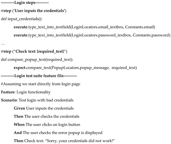 Previously we demonstrated what a simple login test looks like using pseudo-code. With LEE, we do not have limitations in terms of programming languages, and we can optionally use the current international BDD approach, Gherkin. This is widely used in most custom automation frameworks, and one of the reasons for this is because it makes reading a test case much easier. If we want to apply this to our test from Figure 12, we need to create additional files for step implementation and change the way we define the test case. We can reuse all other methods because they can remain the same. An example of this approach is displayed in Figure 13 [16].