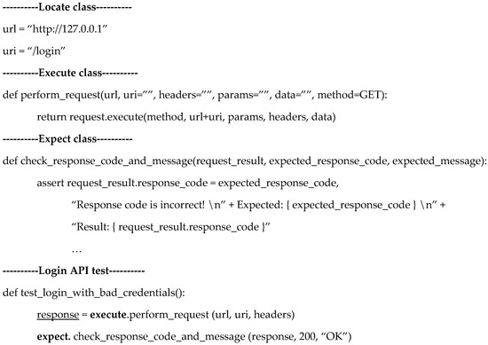 We explained how to use the LEE design pattern for user interface testing. We can apply this design pattern for API testing. When we look at an address of a website in our browser, we notice that most websites with multiple pages have a URL, and this is followed by a URI or by parameters. If we look at how requests work, when we execute a request, we expect a result, no matter of what type of request we are executing. If we look carefully, we can notice a few variables for our tests. We can define URL, URI, or parameters in the Locate layer, methods that are responsible for executing the request in the Execute layer, and verification of the response in the Expect layer. In Figure 14, we exemplified a request test for our login test.