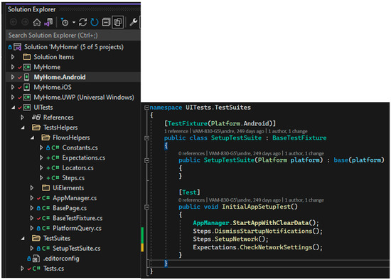 We can use this design pattern with success in testing mobile applications, no matter what programming language we use. We are not limited to white-box testing, we can also carry out gray-box or black-box testing, depending on the technology we are using for developing the application. For example, we created solutions for testing Android applications using Kotlin and Java, where we had a gray-box approach. For iOS testing, it is more like a black-box approach, because that is the way XCUITest works. In this case, however, we used Swift. In Figure 15, we have the Solution Explorer from Visual Studio, where you can see the main classes used to implement LEE. On the right-hand side of Figure 15 is a simple test implementation [16].
