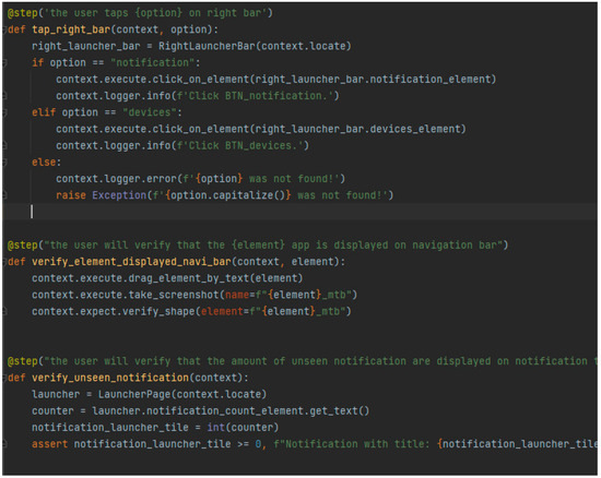 When we test a system or a very complicated application, steps should be separated into two files, one containing the actions and one the verifications. Additionally, we should create files for steps based on what functionality we are testing. This will help reduce the number of code lines in files and also improve code quality. Instead of defining methods inside classes, we can create generic steps. One of the problems with generic steps is that we use them on different pages, and we need to provide the elements we interact with. In this case, we will have a few if–else conditions. From our point of view, combining the example from Figure 12 with Gherkin as it is exemplified in Figure 13 is the best approach because it keeps the code easy to read, the number of code lines minimal, and we can define specific steps. This will be better for junior test automation engineers.