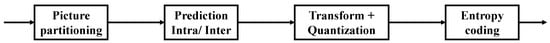 Like the vast majority of video encoders, VVC includes five main steps [3]: The partitioning block that divides the frame into smaller blocks to be encoded, the prediction block, for either intra- or inter-frame prediction, the transform and quantization, and the entropy coding, as illustrated in Figure 1.