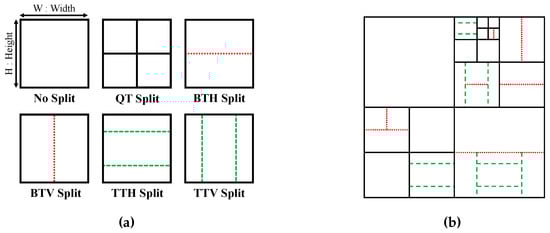 As a result, a picture is segmented into equal-sized blocks called CTU, with a maximum size of 128 × 128 pixels. Then, each frame is processed from top left to bottom right in a raster scan order. Furthermore, in a low level, each CTU is recursively subdivided into smaller blocks, either square or rectangular shapes, called Coding Units (CUs); using the recursive quad tree and finer mode splits binary and ternary tree in both directions, horizontal and vertical. This leads to six possible split modes, including: No Split (NS), Quad Tree (QT), Binary Tree Horizontal (BTH), Binary Tree Vertical (BTV), Ternary Tree Horizontal (TTH) and Ternary Tree Vertical (TTV), as illustrated in Figure 2a.