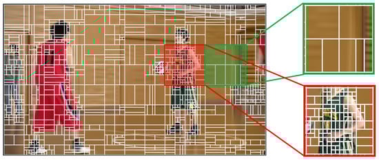 Figure 3 illustrates the first frame of BasketballPass video sequence in the Common Test Conditions (CTC) sequences [26]. This frame was encoded using the VVenC encoder under the All Intra configuration, with a Quantization Parameter (QP) of 37. The smooth areas of the image tend to have fewer details, so larger blocks can be used to encode them as shown in the green square. For areas with complex texture, smaller blocks are used to better capture the details of the image. This allows the encoder to more efficiently compress the data in the video. It is critical here to highlight that there are additional factors that influence coding efficiency and encoding time—for instance, the QP value as well as the depth of QT and MTT splits. Overall, the RDO process is a computationally intensive process, as it requires evaluating the RD cost for a large number of possible CU partitions. However, it is a highly effective technique for achieving high-quality video compression, as it enables the encoder to select the optimal coding mode for each CU based on its content and complexity.