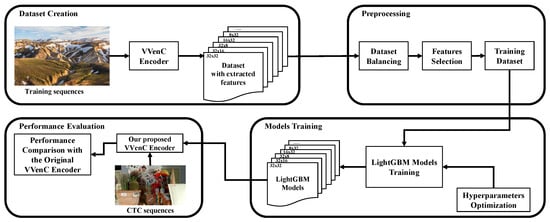 The main stages of our approach are illustrated in Figure 4. First, a set of video sequences was created using different image databases such as Div2k, 4K images, and flickr2k. These video sequences were then encoded using the modified VVenC encoder capable of calculating the CU texture information and other features to generate the dataset of each split mode over the six possible options in the QTMTT scheme, including No split, QT, BTH, BTV, TTH, and TTV. The dataset was preprocessed in the preprocessing stage using dataset balancing and feature mutual information to select the most important features for the training process. In the training stage, the hyper-parameters were optimized using the Optuna tool [34], and then they were used to train our classifiers to be integrated into the VVenC encoder. Finally, our proposed encoder was evaluated according to the Common Test Conditions [26] using the 22 CTC video sequences, and the four values of QP including 22, 27, 32, and 37. The results are presented in the experimental results Section 4.