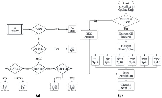 The proposed approach algorithm and its implementation flowchart. (a) The proposed algorithm for CU partition selection. (b) Flowchart of the proposed approach.