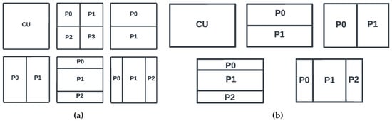 The calculation of these features is performed for the entire CU and all of its sub-CUs parts denoted by . For a square-shaped CU, the features are calculated for the sub-CUs parts as shown in Figure 6a. In the case of a rectangular CU, the features are calculated by evaluating its respective sub-CUs parts, as depicted in Figure 6b.