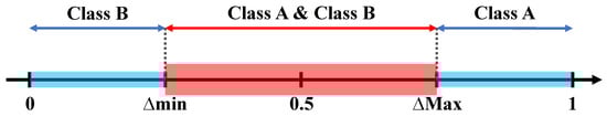 Misclassification is a common problem in classification tasks, where classifiers may incorrectly assign an instance to a class [35]. One reason for misclassification is the use of default thresholds for making classification decisions. These thresholds may not always be optimal for a particular dataset or task, leading to a poor performance. To address this issue, we used the risk intervals as a way to increase the classification performance. Risk interval is defined as a range of predicted probabilities or scores that are used to decide which class a given sample should be assigned to. In our case, we trained binary classifiers with two possible outputs; class A and B, where: (A, B) ∈ {(S, NS), (QT, MTT), (Hor, Ver), (BTH, TTH), (BTV, TTV)}. A given binary classifier output class is: class A when its output probability is greater than Max, and class B when output probability is less than min. Otherwise, the two possible classes are tested when the output probability is in the risk interval, i.e., between min and Max, as shown in Figure 7, where min and Max are the minimum and maximum boundaries for decisions A and B, respectively.