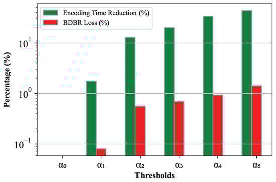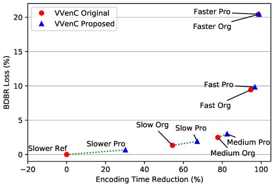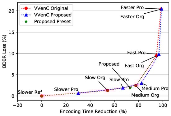 Figure 9 illustrates the trade-offs between the encoding time saving and the BDBR loss for each VVenC preset, when comparing the original and the proposed solution. It shows that the proposed approach can significantly save more time with a slight increase in BDBR degradation, which is confirmed by the results presented in Table 10.
