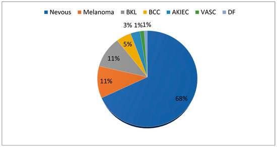 In this manuscript, we employed the HAM-10000 image dataset, which was created by the International Skin Image Collaboration (ISIC) in 2018 [26] and is publicly accessible. The HAM-10000 dataset comprises seven types of dermoscopic images of skin cancer, which were sourced from diverse populations and acquired by various modalities. The selected dataset includes multiple images of a similar lesion, collected at different times and under different lighting conditions, which provides additional variability to the dataset. This can help to improve the robustness of the ensemble learning model by enabling it to handle variations in image quality and illumination. The HAM-10000 dataset was primarily compiled by two organizations from two countries: Cliff Rosendahl’s organization from Queensland, Australia, and the Dermatology Department of the Medical University of Vienna, Austria. The assemblage of this dataset was the culmination of two decades of tireless effort [27]. The weight of each of the seven categories is depicted in Figure 2.