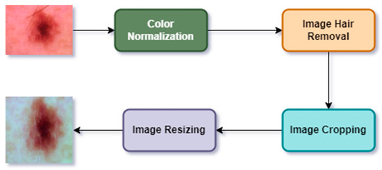 Some of the images in the skin cancer dataset have hidden regions due to skin hair. Consequently, prior to further analysis or processing, it is necessary to perform preprocessing of the skin images with the objective of removing artifacts that are present in the images. For this purpose, we applied morphological filtering to clean the presence of hair from the skin images. We also applied the crop function to eliminate the unnecessary part of the image. All steps of image preprocessing are shown in Figure 3. After that, we reduced the image size from 450 × 600 to 384 × 384 resolutions.