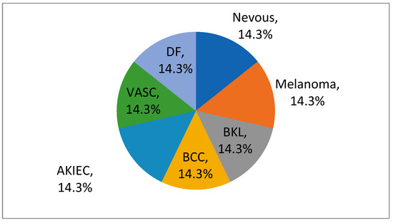 Data augmentation is a widely adopted technique in conjunction with convolutional neural network models, particularly in scenarios where the image dataset is imbalanced. In this context, we noted that HAM-10000 is a multi-class skin dataset that is modest in size and also exhibits imbalanced class distribution. Specifically, certain classes possess fewer images compared to others, creating an imbalance in the dataset. The application of data augmentation methods effectively addresses both the size and imbalance disparities, as depicted in Figure 4. It is noteworthy that all image categories carry equal weight, accounting for 14.3% of the dataset.