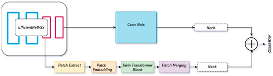 EffcientNetV2S was employed as the foundational model, with an input size of 384 for the image. The fifth block of the base model was subsequently adjusted, and the block_5_02_expand activation layer was utilized as input for the Swin-Transformer model. We obtained 24 output sizes from the combined output of the adapted model and base model, and this merged layer was then processed by the final classification layer.